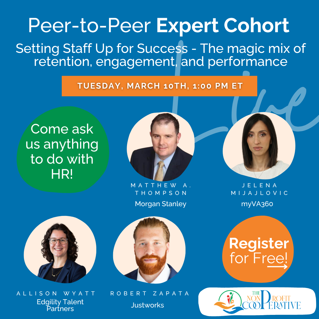 At The Nonprofit Cooperative, we’re dedicated to empowering nonprofit organizations through our dynamic and free events. From workshops and webinars to summits, lunch & learns, meet & greets, and panel discussions, our events offer valuable insights, strategies, and networking opportunities to help you achieve your mission and drive impactful change.